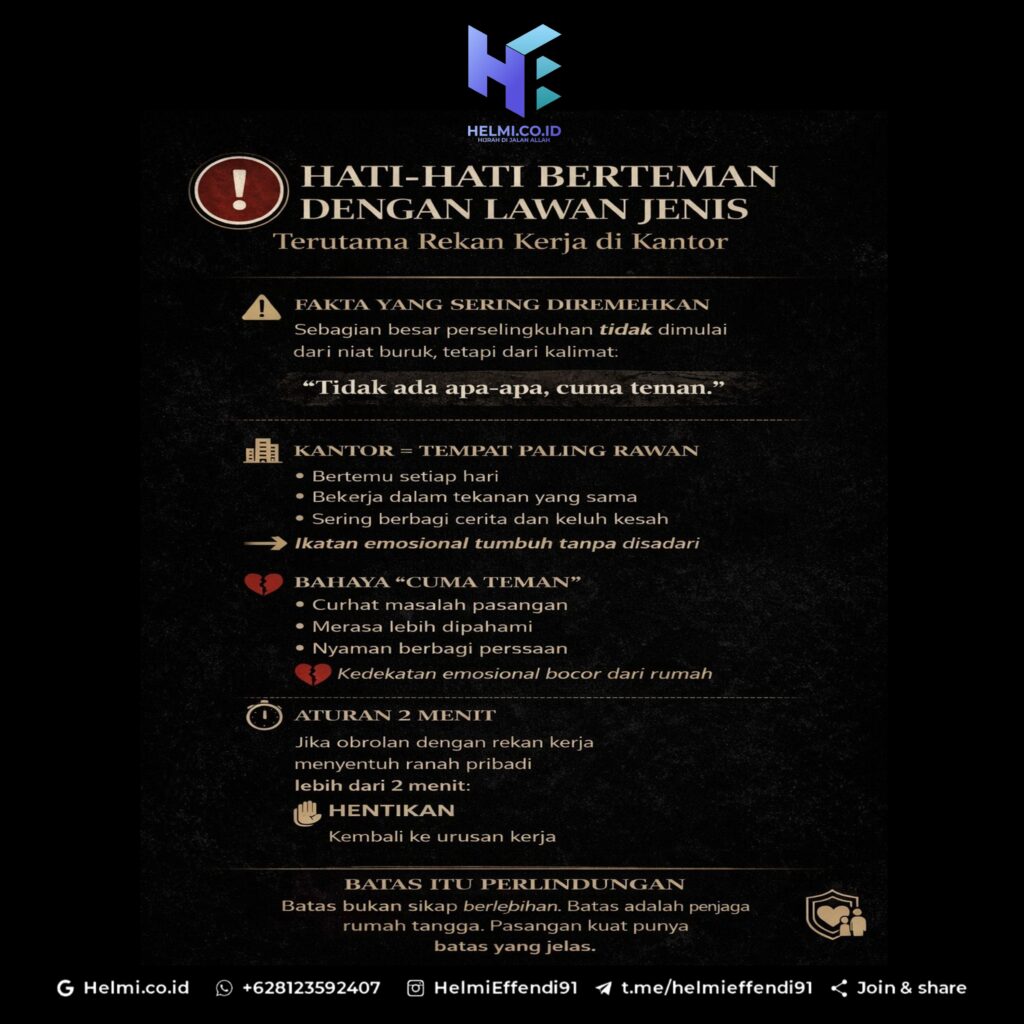 Agama Islam mengajarkan bahwa fitnah terbesar sering datang dari hal-hal yang tampak biasa. Salah satunya adalah kedekatan tanpa batas antara laki-laki dan perempuan. Fakta menunjukkan bahwa tempat kerja adalah lahan paling subur bagi perselingkuhan. Data Forbes Advisor (2023) mencatat bahwa 43% perselingkuhan terjadi dengan rekan kerja atau di lingkungan kantor. Artinya, kantor mengalahkan bar, pusat […]