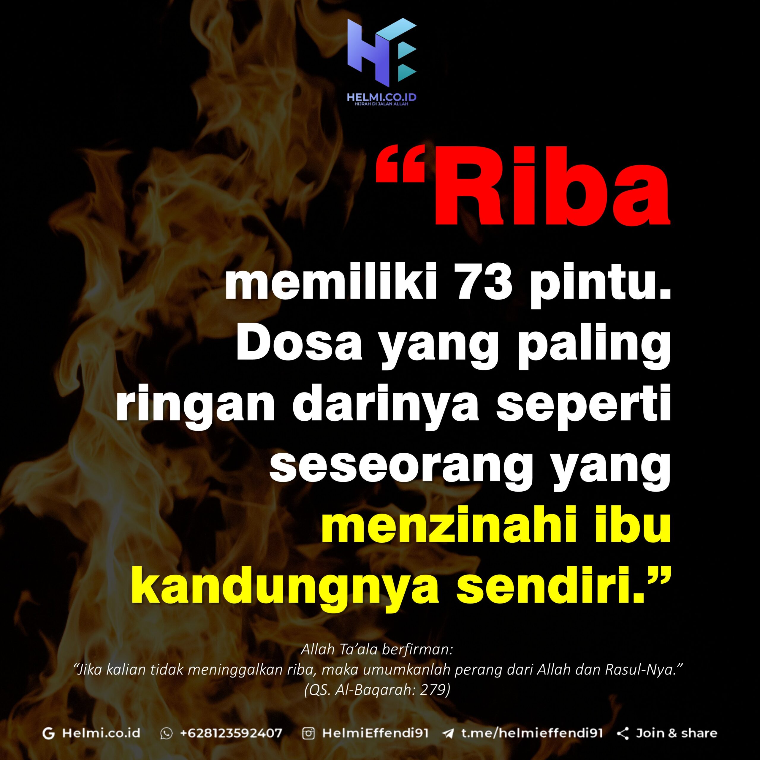 “Riba memiliki tujuh puluh tiga pintu. Dosa yang paling ringan darinya seperti seseorang yang menzinahi ibu kandungnya sendiri.”